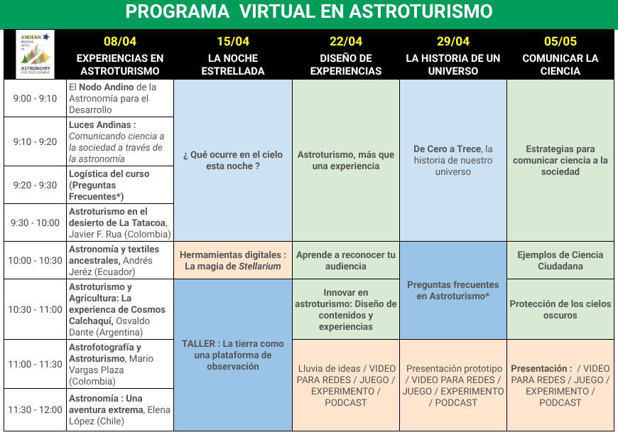 Se entregará certificado de participación por parte de la Oficina Regional Andina de la Astronomía para el Desarrollo (OAD-IAU) para participantes que hayan cursado la totalidad de las sesiones.